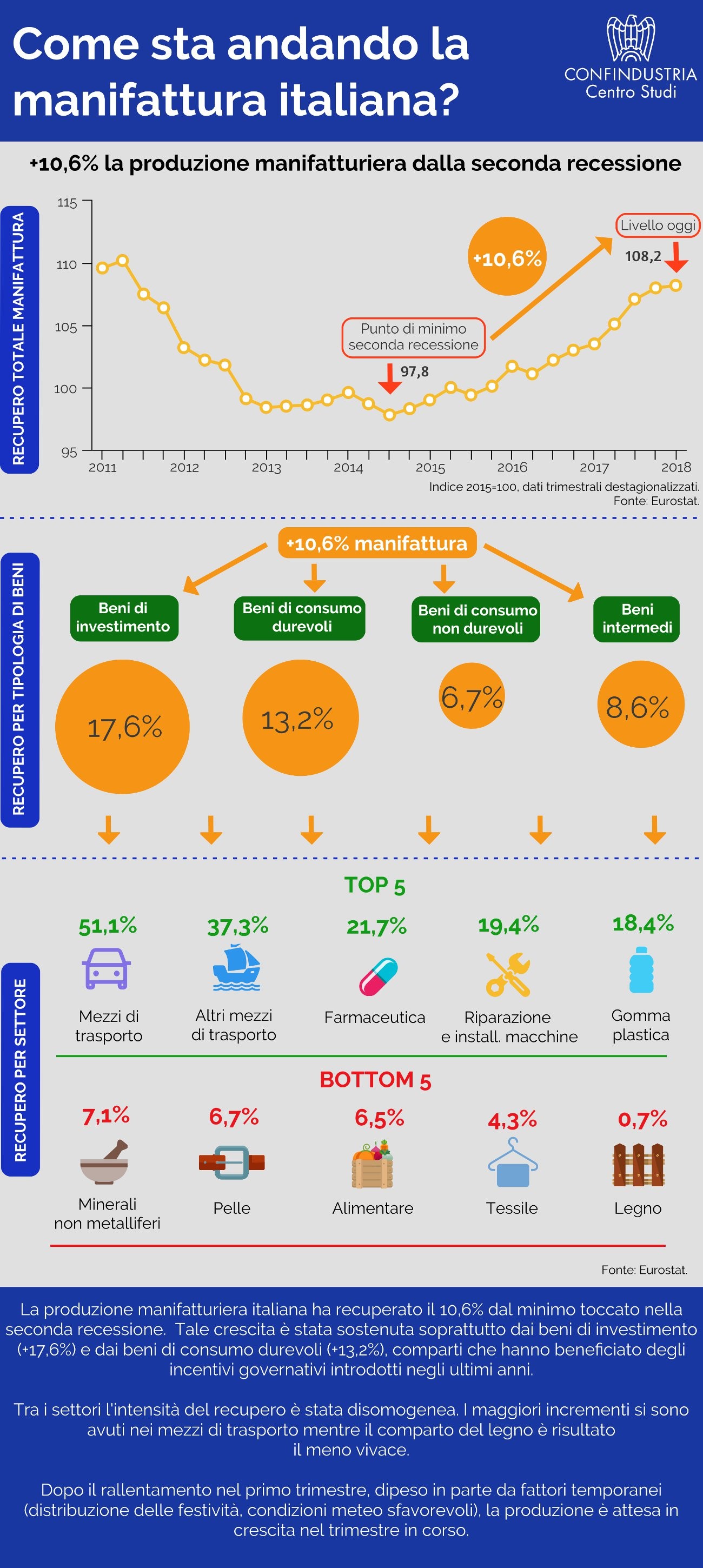 La produzione manifatturiera italiana ha recuperato il 10,6% rispetto al minimo toccato nella seconda recessione, grazie soprattutto ai beni di investimento (+17,6%) ed ai beni durevoli (+13,2%). I maggiori incrementi si sono avuti nei mezzi di trasporto, il comparto meno vivace è invece risultato essere il legno. Ci si attende una crescita della produzione nel trimestre in corso.