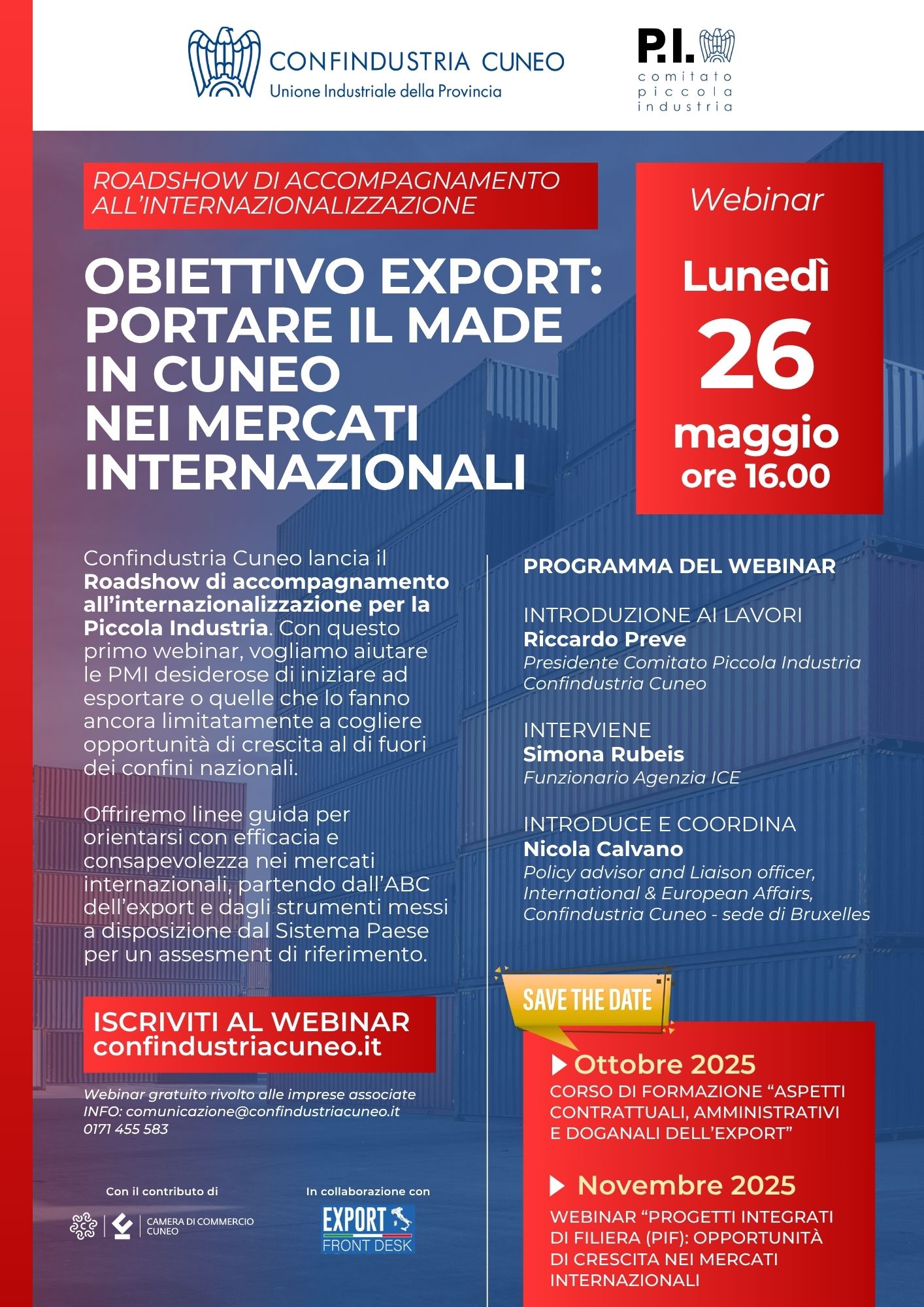 Webinar - Obiettivo Export: portare il Made In Cuneo nei mercati internazionali - lunedì 26 maggio ore 16.00