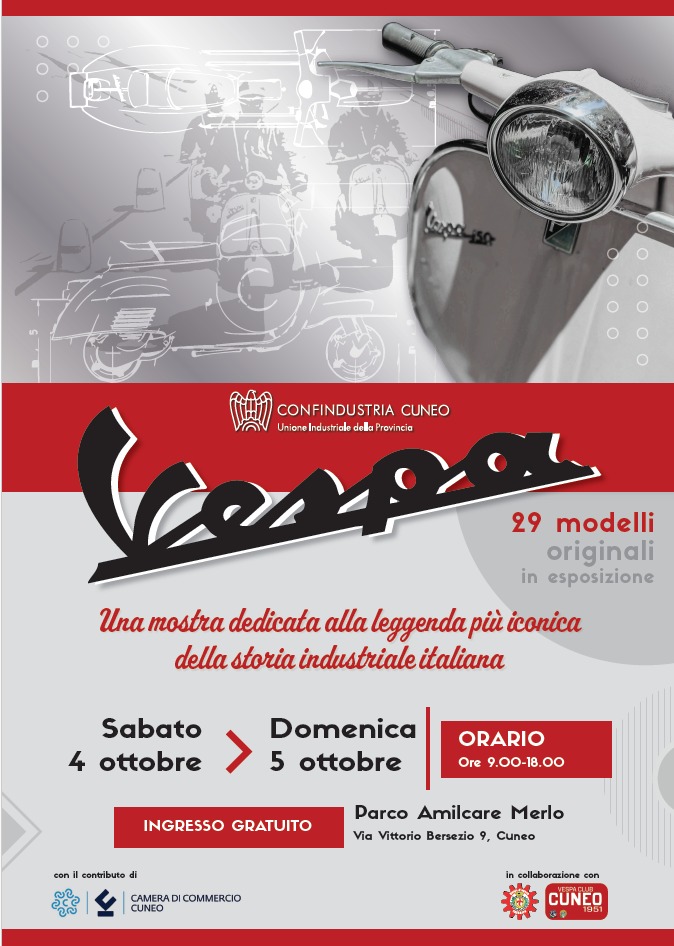 L’iniziativa, realizzata con il supporto della Camera di Commercio di Cuneo e in collaborazione del Vespa Club Cuneo e Ruote d’epoca di Cherasco, consentirà di ammirare nel parco “Amilcare Merlo” di Confindustria Cuneo (via Bersezio 9, Cuneo) ben 29 modelli originali di Vespa, che coprono oltre 30 anni di storia.