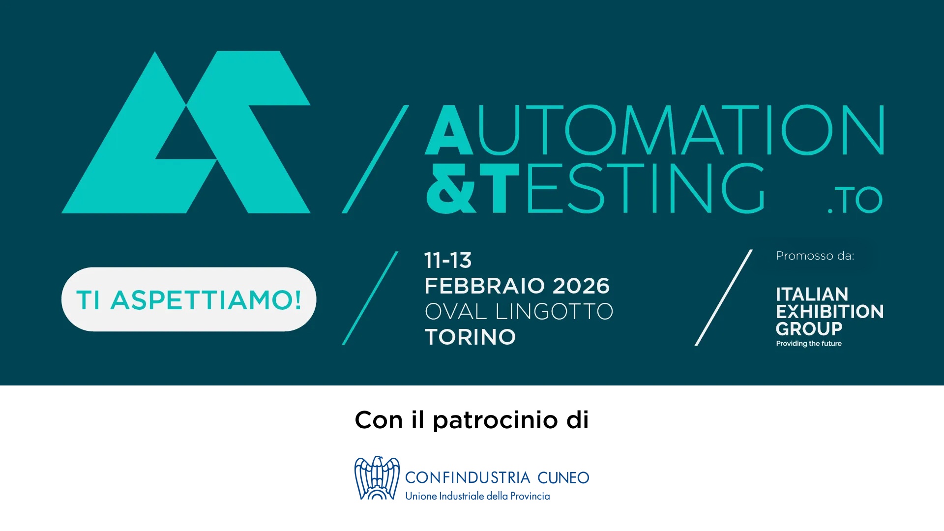 Dall’11 al 13 febbraio presso Oval Lingotto Fiere di Torino si svolgerà la Fiera A&T - AUTOMATION & TESTING, di cui Confindustria Cuneo è Partner.