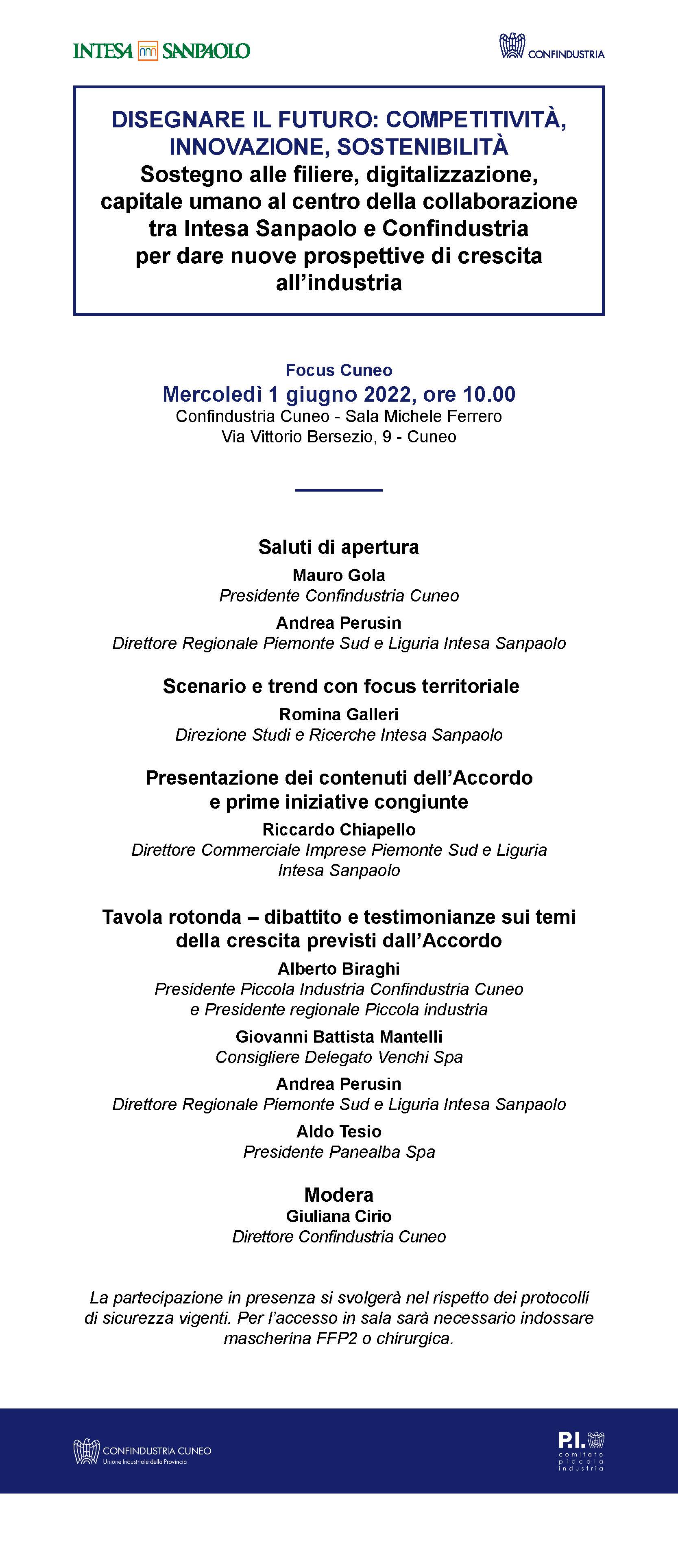 Intesa Sanpaolo e Confindustria Cuneo organizzano un convegno dal titolo "Disegnare il futuro: Competitività, Innovazione, Sostenibilità - Sostegno alle filiere, digitalizzazione, capitale umano al centro della collaborazione tra Intesa Sanpaolo e Confindustria per dare nuove prospettive di crescita all’industria", in programma mercoledì 1° giugno alle ore 10.00 in Sala Michele Ferrero (Via Vittorio Bersezio 9, Cuneo).