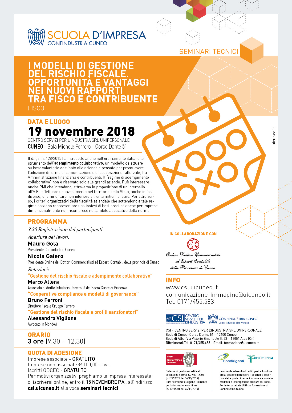 Seminario “I modelli di gestione del rischio fiscale. Opportunità e vantaggi nei nuovi rapporti tra fisco e contribuente" - Cuneo, 19 novembre 2018, ore 9.30