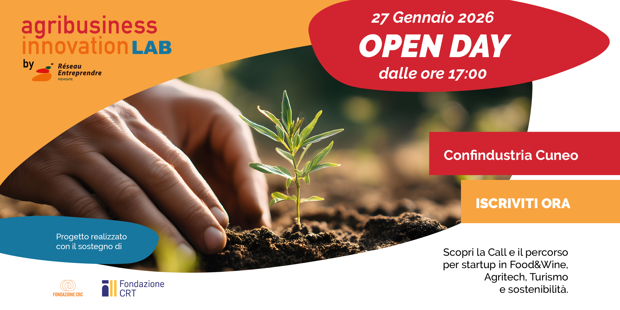 Agribusiness Innovation Lab è il percorso di accelerazione nato per supportare startup e nuove imprese con idee innovative nei settori Food & Wine, Agritech, Turismo e Sostenibilità. Promosso da Réseau Entreprendre Piemonte con partner strategici, il programma offre mentoring personalizzato, networking con esperti e investitori, workshop tematici e strumenti concreti per far crescere i progetti — oltre a un montepremi complessivo di €18.000 in denaro e servizi per le realtà più meritevoli.