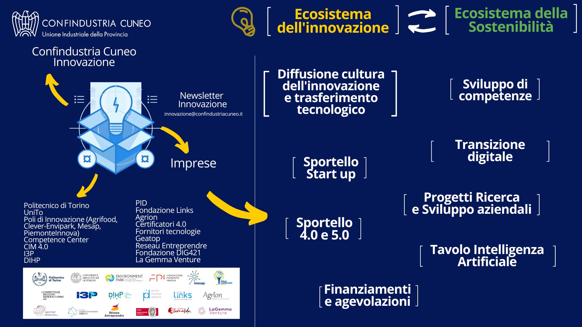Confindustria Cuneo ha costituito nel 2017 l’”ecosistema dell’innovazione”: una rete di partner a supporto delle imprese nei processi di innovazione, percorsi di trasformazione digitale, sviluppo delle competenze e di progetti di Ricerca e Sviluppo.
